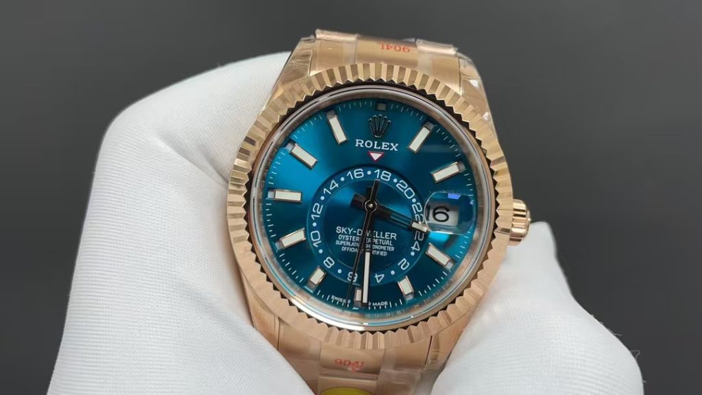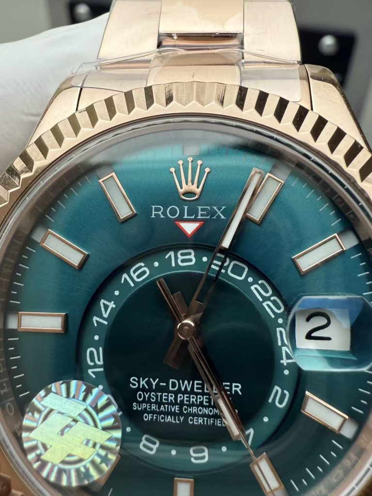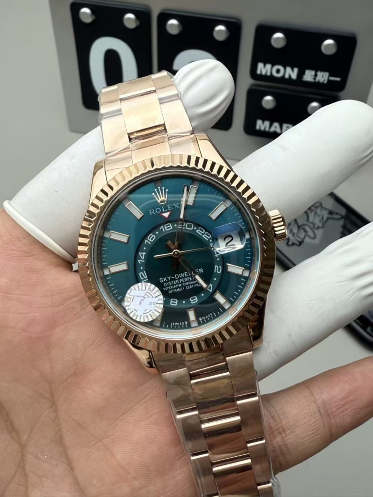 The Noob Factory Rolex Sky-Dweller 336935 with teal dial and rose gold finish is best understood as a visually faithful interpretation of one of Rolex’s most complex designs. Its strengths lie in case proportions, dial execution, bracelet quality, and overall wrist presence.