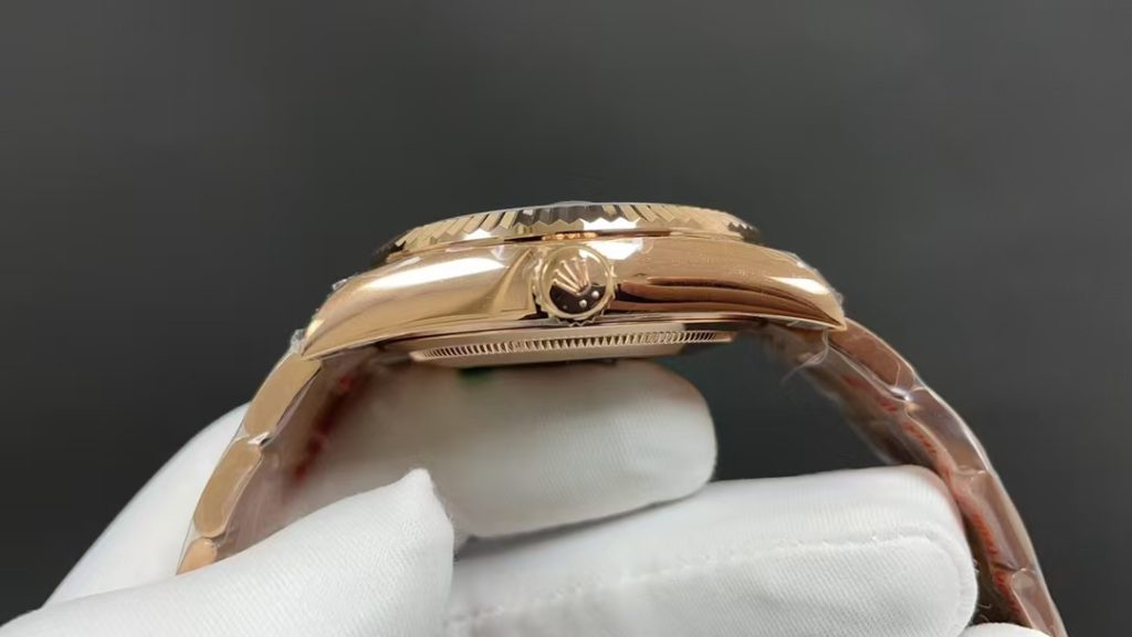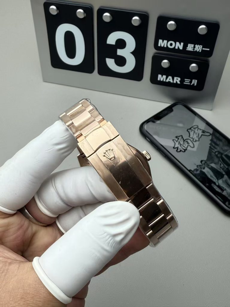 The fixed fluted bezel, finished in rose gold plating, is visually faithful to the Sky-Dweller’s signature appearance. It is crafted from solid 904L steel and treated with a DLC scratch-protection coating, giving it a crisp reflective finish.