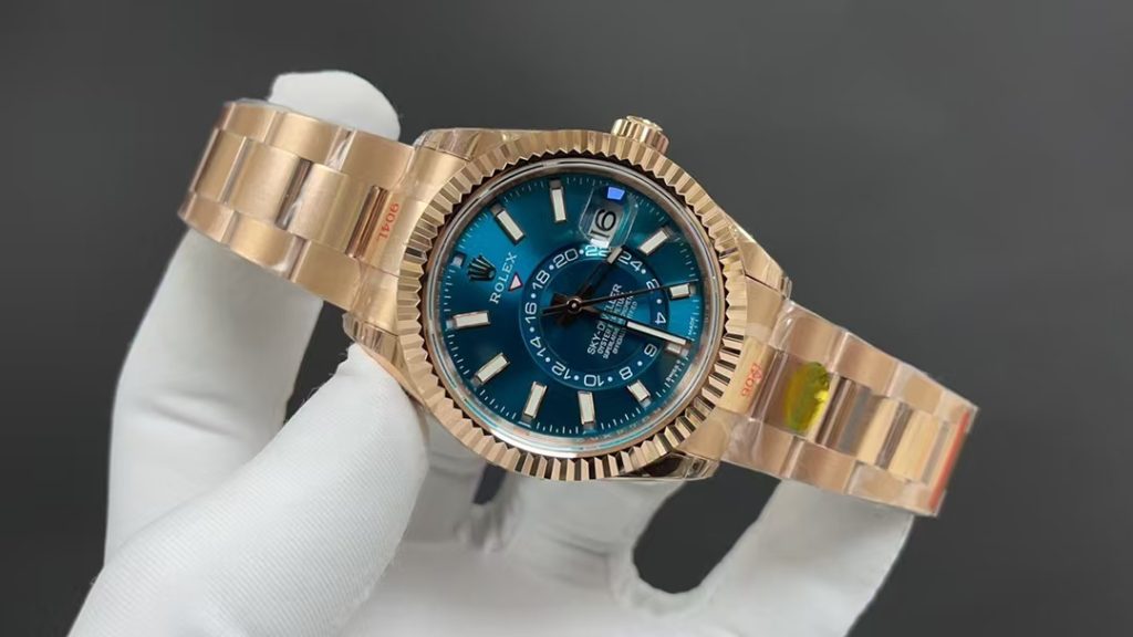 The watch features a 42mm Oyster-style case crafted from solid 904L stainless steel with rose gold plating. The size aligns closely with the genuine Sky-Dweller, and on the wrist, it delivers the same bold, contemporary presence that defines the model.