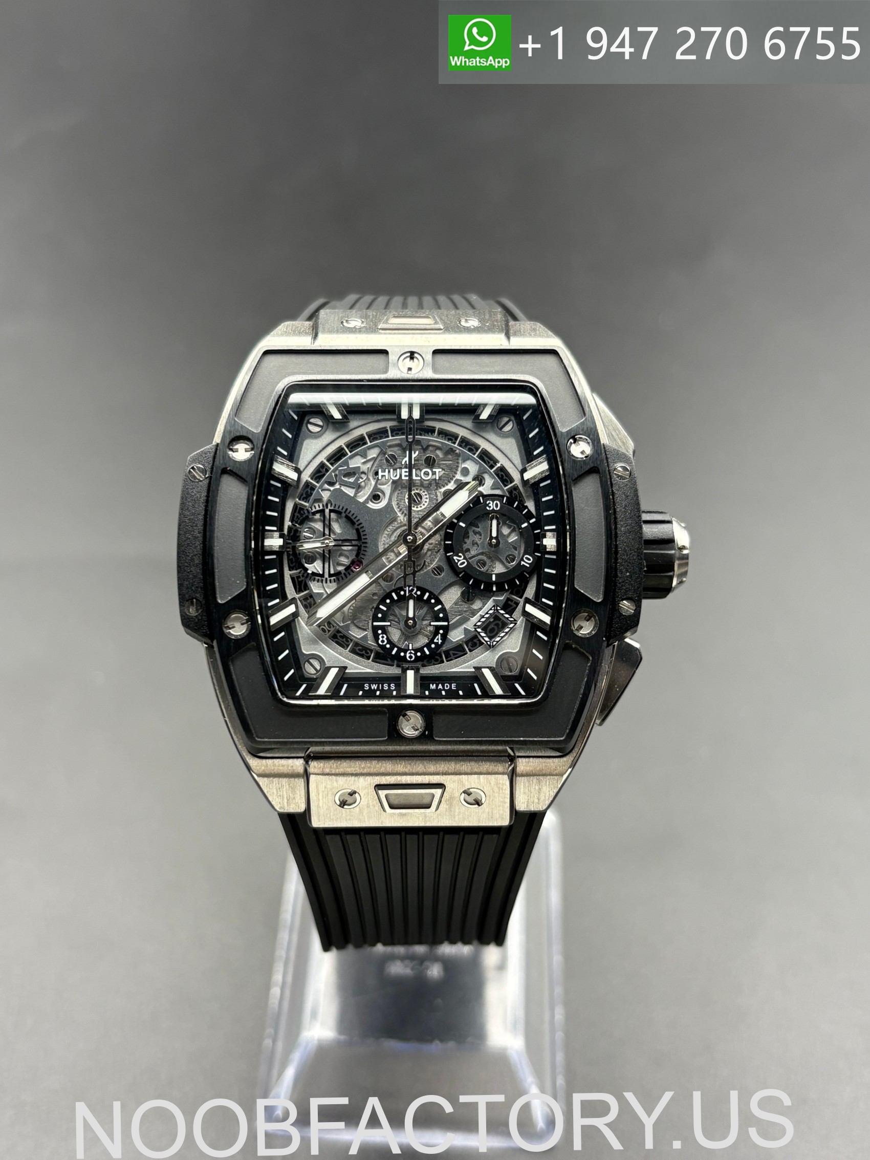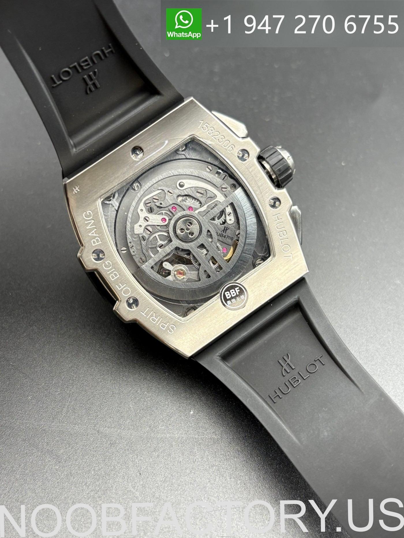 – Case: The Hublot Spirit of Big Bang Chronograph is an extraordinary fusion of design innovation and mechanical excellence. Built from titanium and ceramic, its 45mm barrel-shaped case perfectly captures Hublot’s “Art of Fusion” philosophy—combining strength, lightness, and modern aesthetics in a single piece.