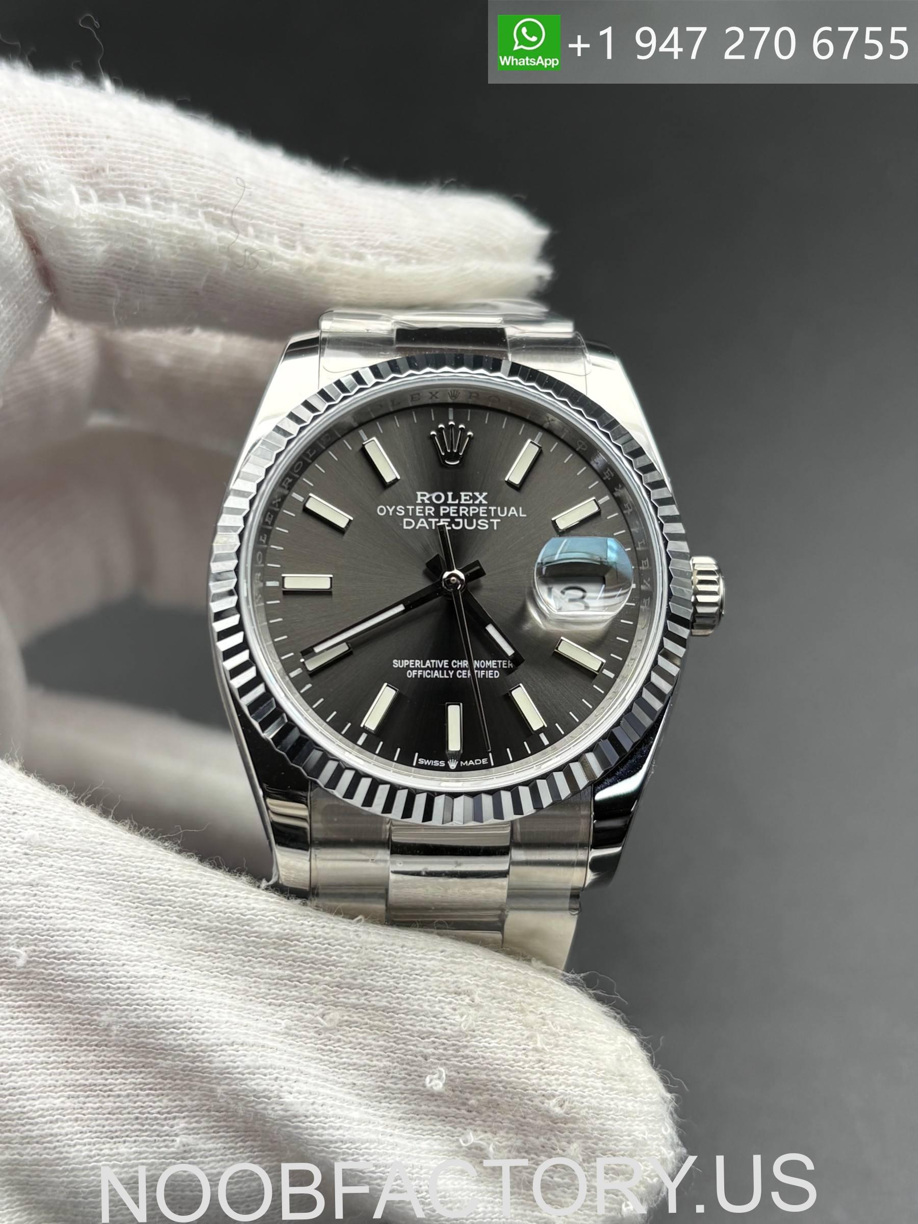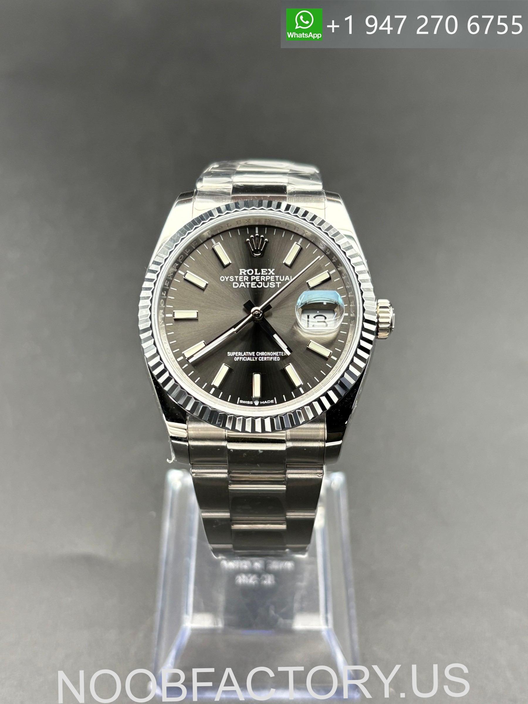 The NOOB Factory Rolex Datejust 36mm in Slate Grey is a highly accurate super clone that captures the technical specifications and classic aesthetic of this timeless model. Featuring a distinctive fluted bezel, a sunburst dial, and the robust Oyster bracelet, this 36mm model offers a balanced and versatile profile for daily wear based on objective evaluation standards.