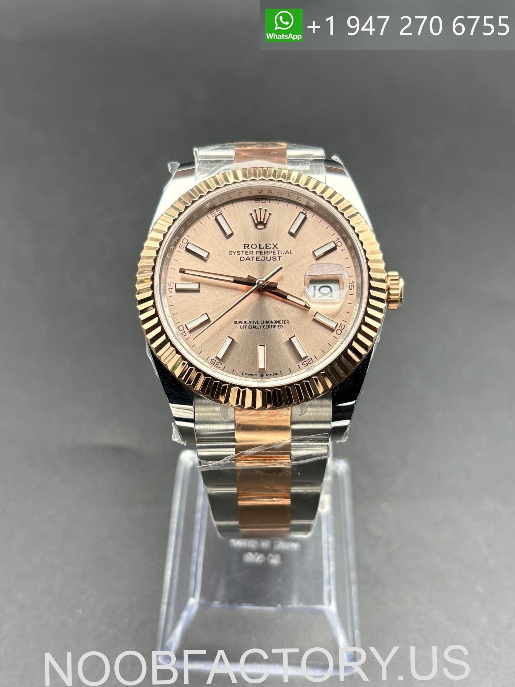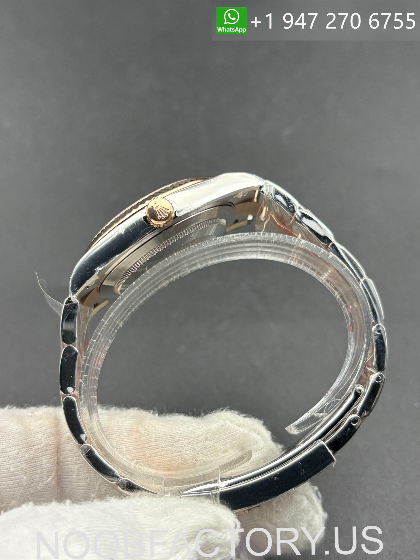 – **Case**: This Rolex Datejust features a classic 41mm Oyster case, crafted from a combination of 904L stainless steel and 18K rose gold (Everose Rolesor style). The polished steel lugs contrast elegantly with the signature fluted bezel in rose gold, delivering a timeless aesthetic that blends sporty robustness with refined luxury. The screw-down crown with Twinlock double waterproofness system ensures a water resistance of up to 100 meters, making it ideal for daily wear and occasional aquatic exposure. The case construction precisely mirrors Rolex’s original proportions and curvature, thanks to super clone manufacturing standards.