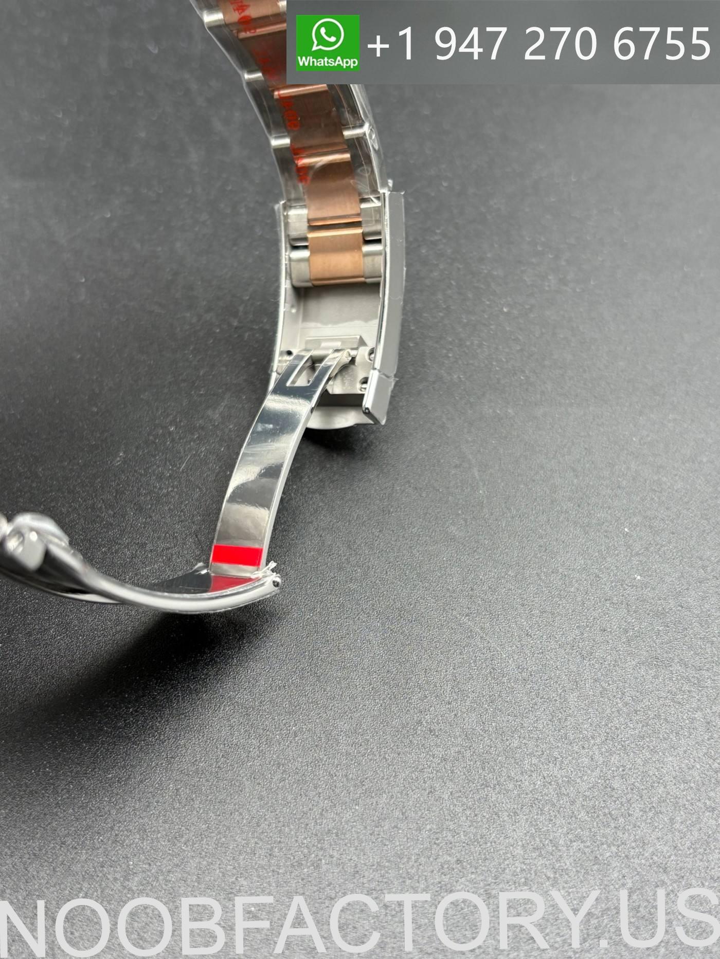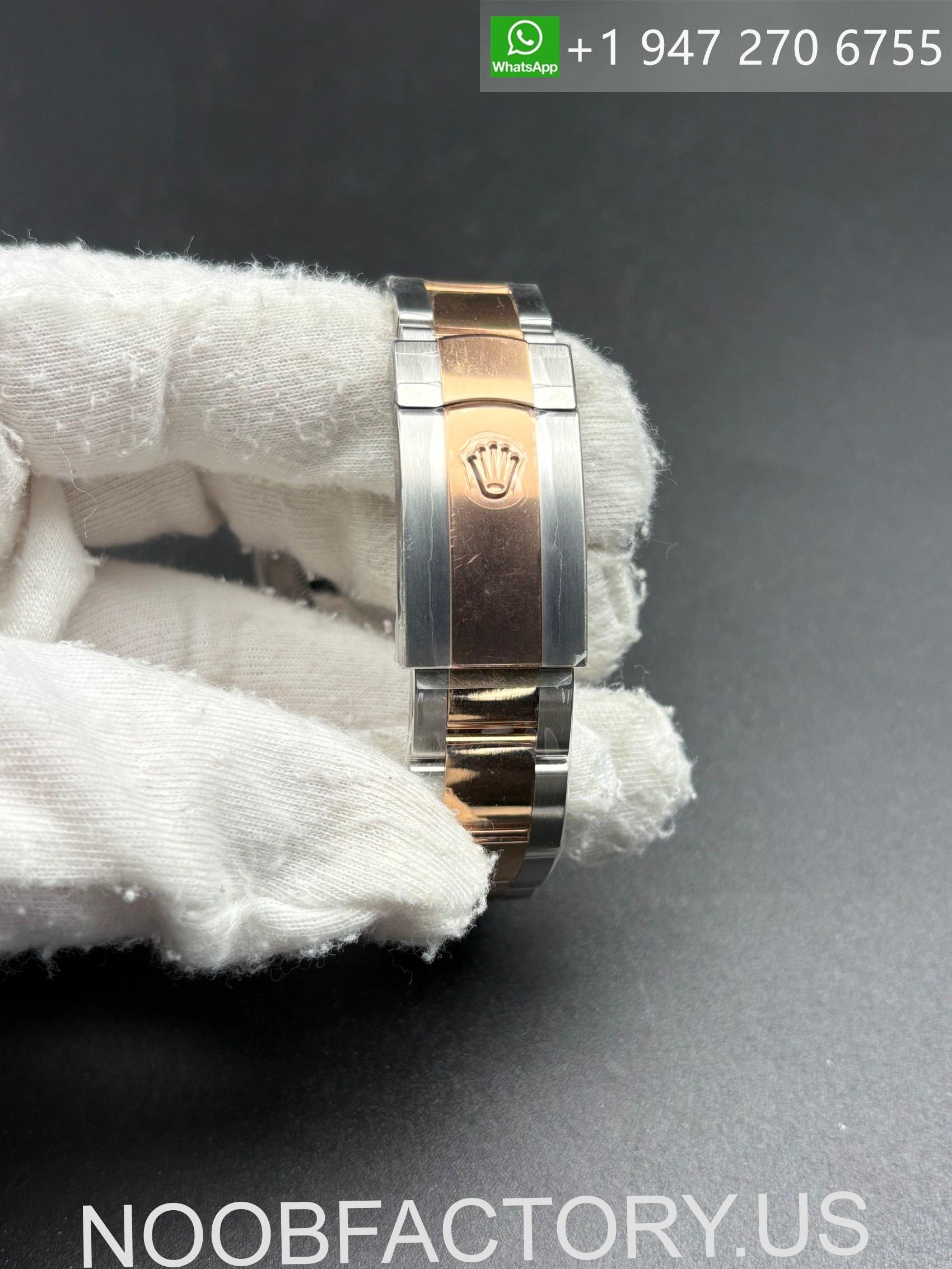 – **Bracelet**:The bracelet is a two-tone Jubilee design, crafted with solid 904L stainless steel outer links and 18K rose gold-coated center links. This configuration ensures both durability and sophistication. The folding Oysterclasp is equipped with the Easylink 5mm comfort extension system, allowing users to adjust the fit with ease. With its smooth articulation and mirror-finished center links, the bracelet not only looks authentic but feels virtually identical to the genuine Rolex experience on the wrist.