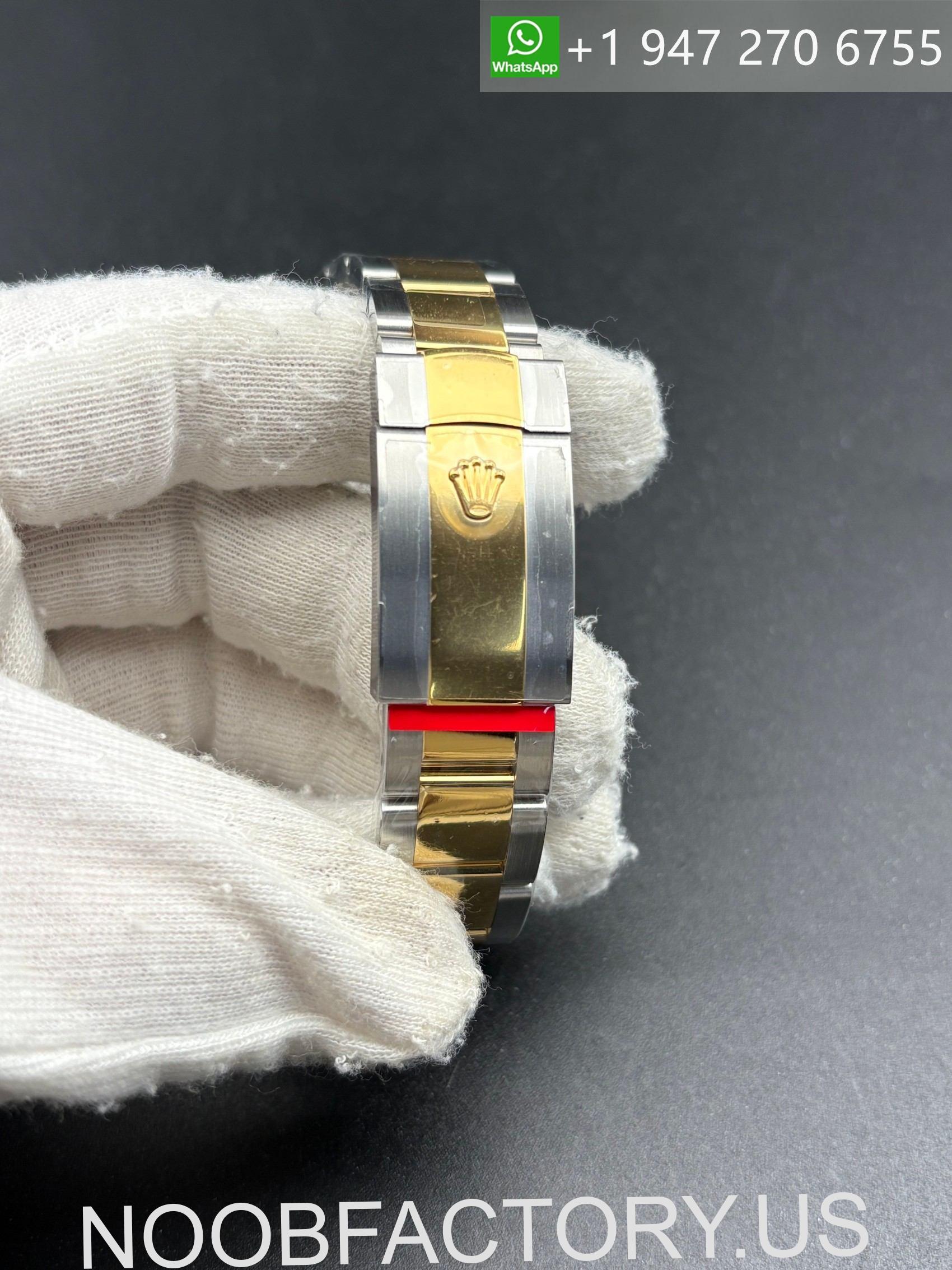 – **Bracelet**: The Oyster bracelet features flat three-piece links made of solid 904L stainless steel with a DLC scratch-protection coating,the middle part is 18k gold plated.It includes a folding OysterLock safety clasp with the Easylink 5 mm comfort extension system, mirroring the original design.