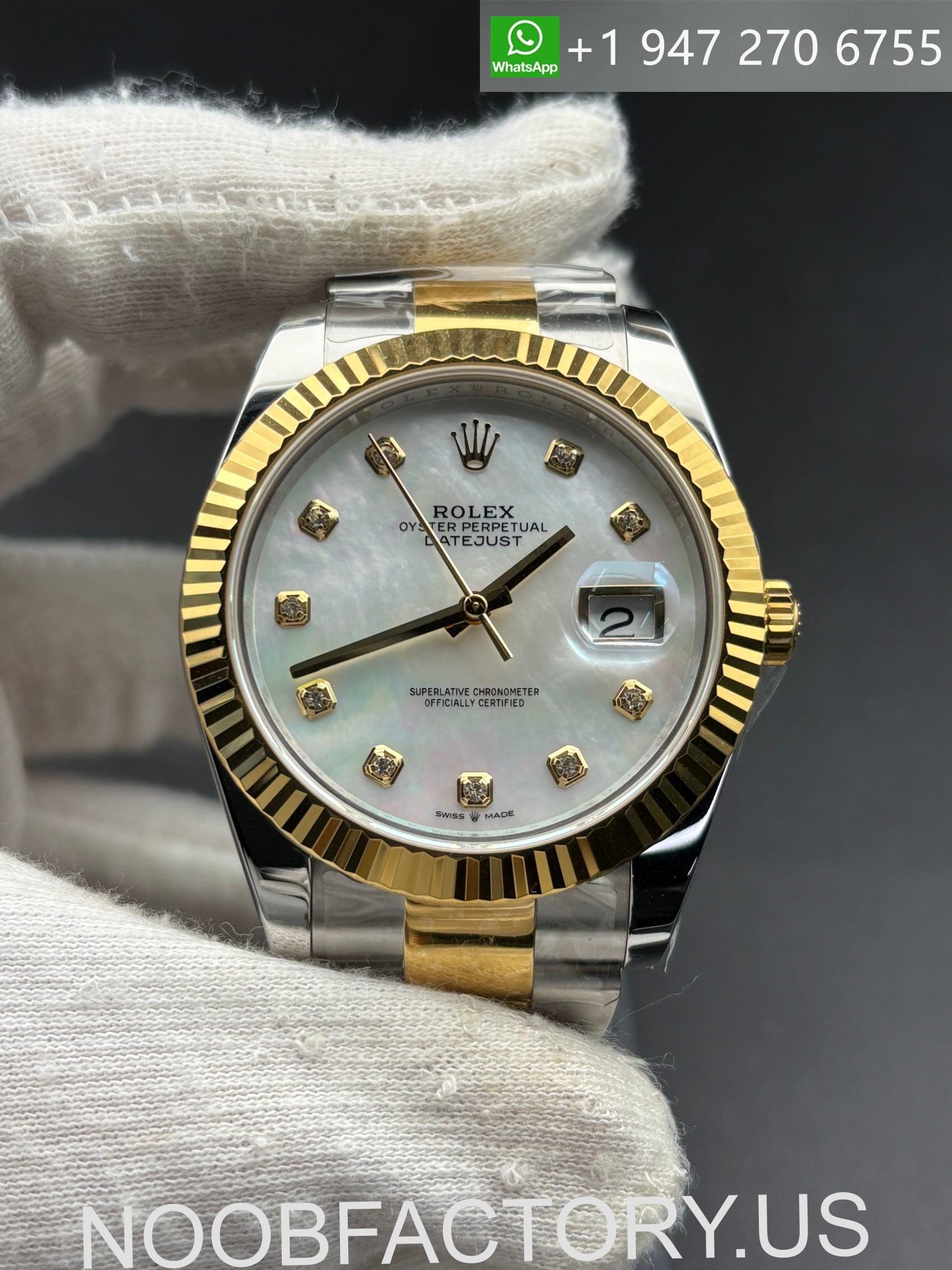 – **Dial**: This Rolex Datejust features a white mother-of-pearl dial set with diamond hour markers in yellow gold settings, creating a refined balance of luxury and elegance. The two-tone stainless steel and yellow gold construction, combined with the fluted bezel, enhances its timeless aesthetic. The craftsmanship of the dial, from the natural iridescence of the mother-of-pearl to the precise diamond setting, closely mirrors the sophistication of genuine Rolex standards.