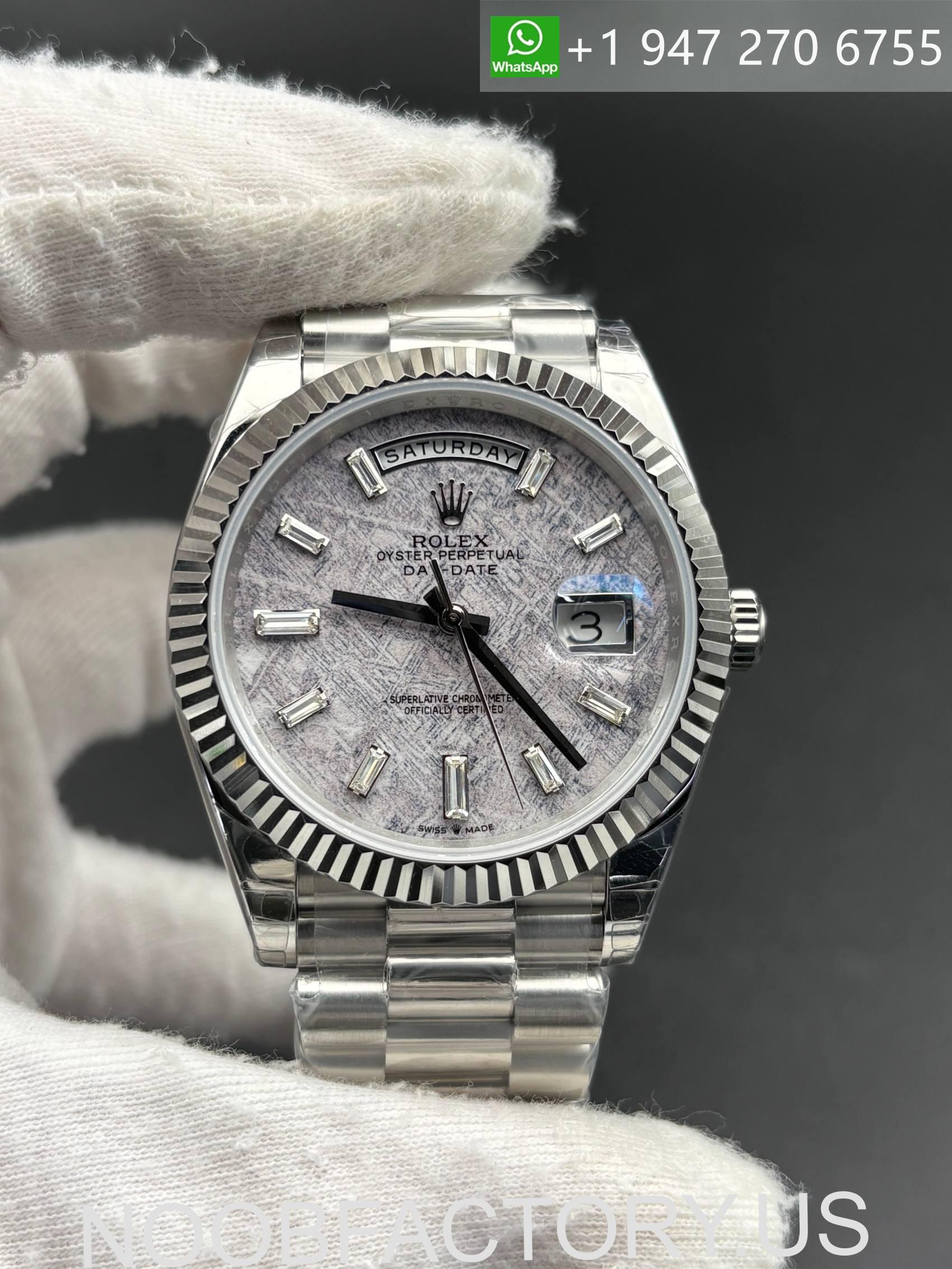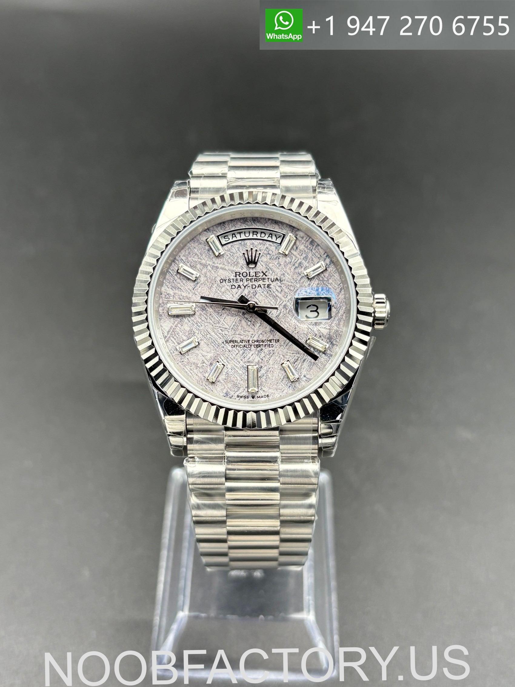 The NOOB Factory Rolex Day-Date 40 Meteorite Dial is a top-tier super clone that showcases the ultimate combination of luxury, rarity, and technical precision. Featuring a genuine meteorite-style dial paired with baguette hour markers, this model represents the highest level of craftsmanship within the Day-Date collection and stands as one of the most visually striking configurations available.