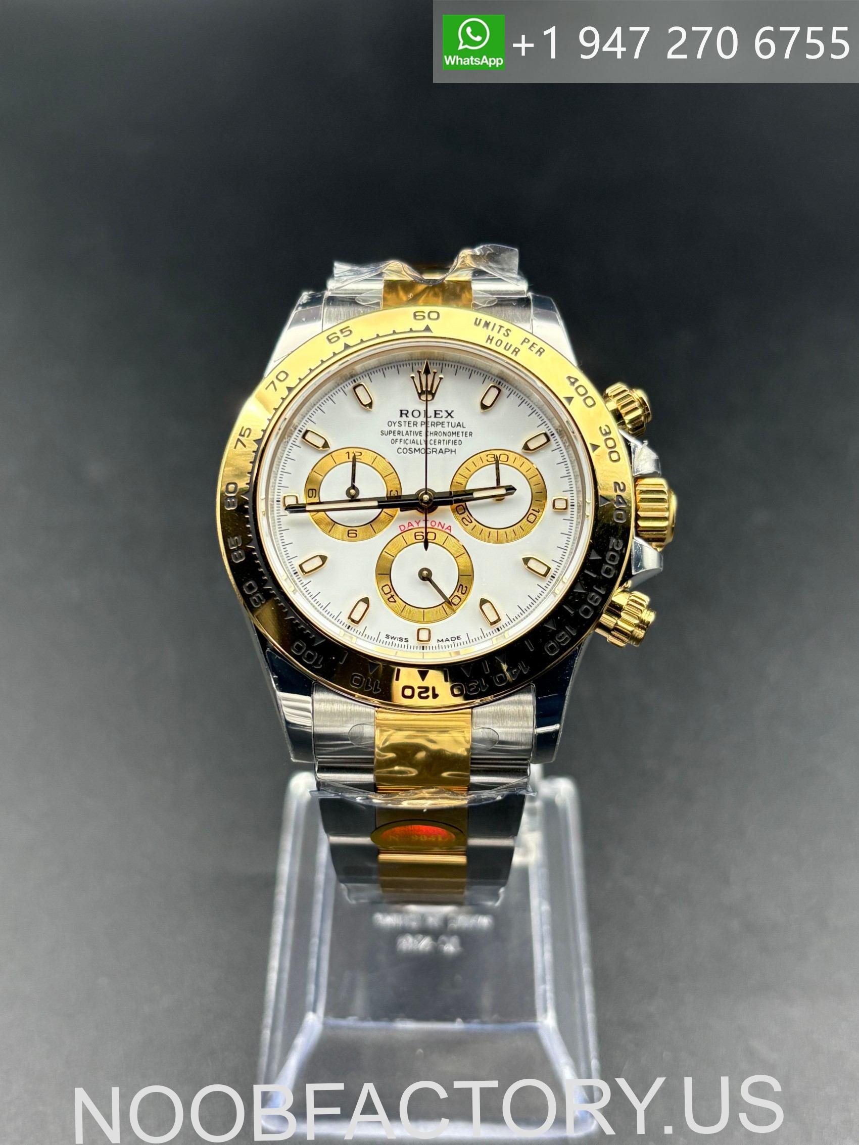 The NOOB Factory Rolex Cosmograph Daytona 116503 with white dial represents one of the most balanced and mature two-tone Daytona interpretations available. Combining the iconic Daytona layout with a clean white dial and gold sub-dials, this version emphasizes classic motorsport aesthetics while maintaining strong everyday wearability.