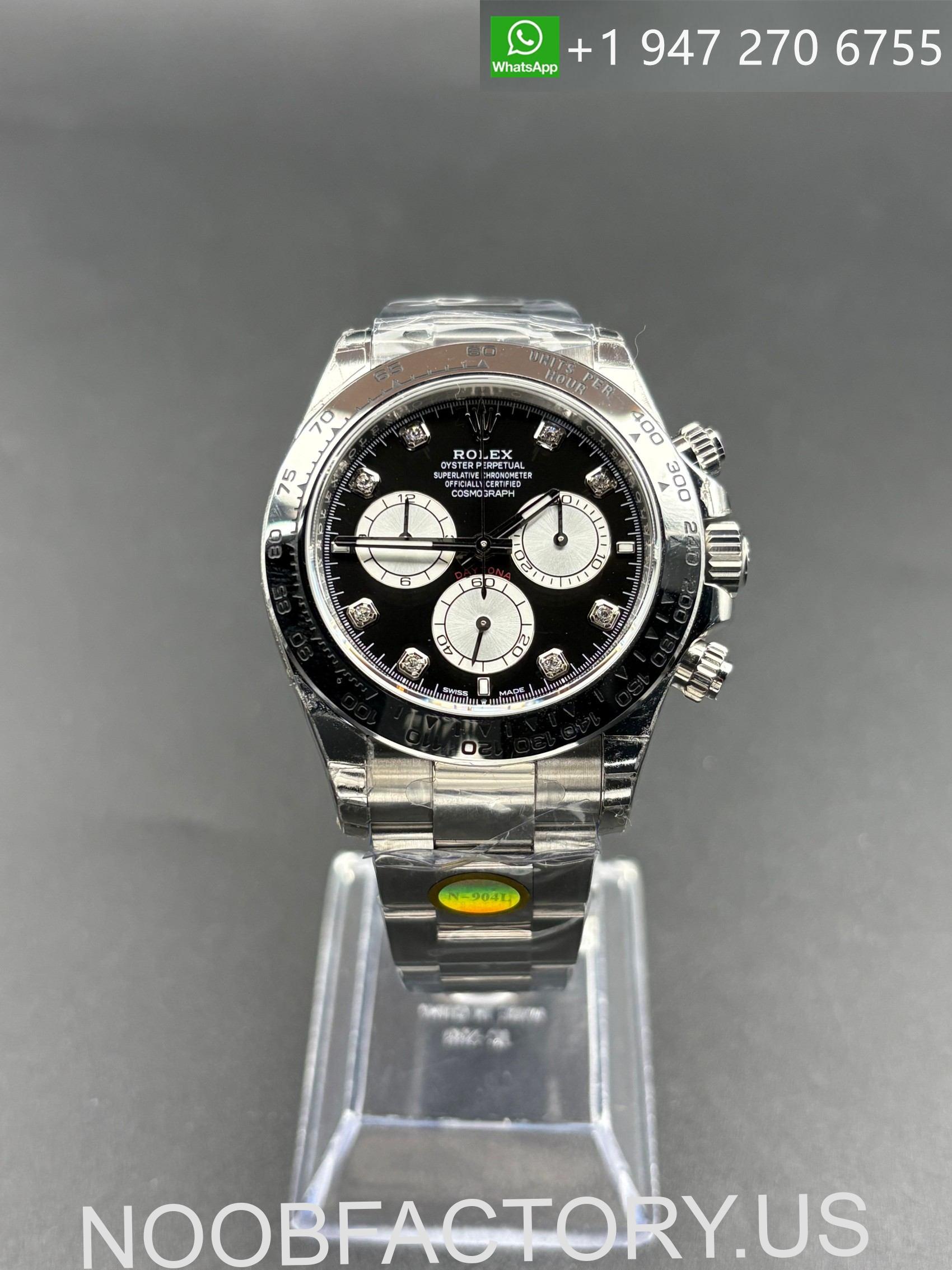The NOOB Factory’s Rolex Cosmograph Daytona Black Diamond Dial edition is a refined super clone that captures the timeless elegance and racing DNA of the Daytona series. Featuring a deep black dial set with brilliant diamond hour markers and updated chronograph sub-dial proportions, this model reflects both luxury and technical precision—perfectly complementing the upgraded clone Rolex 4131 movement.