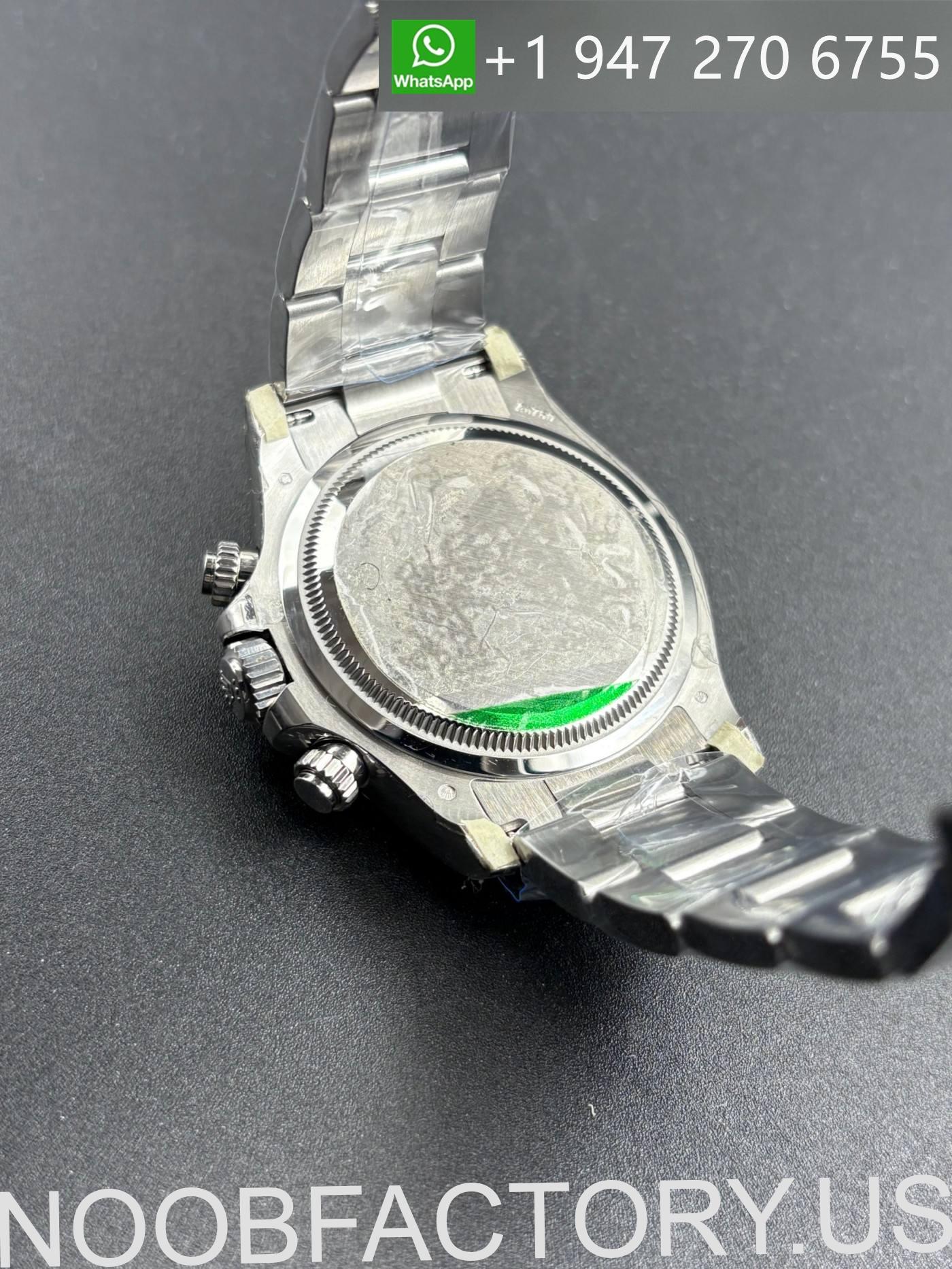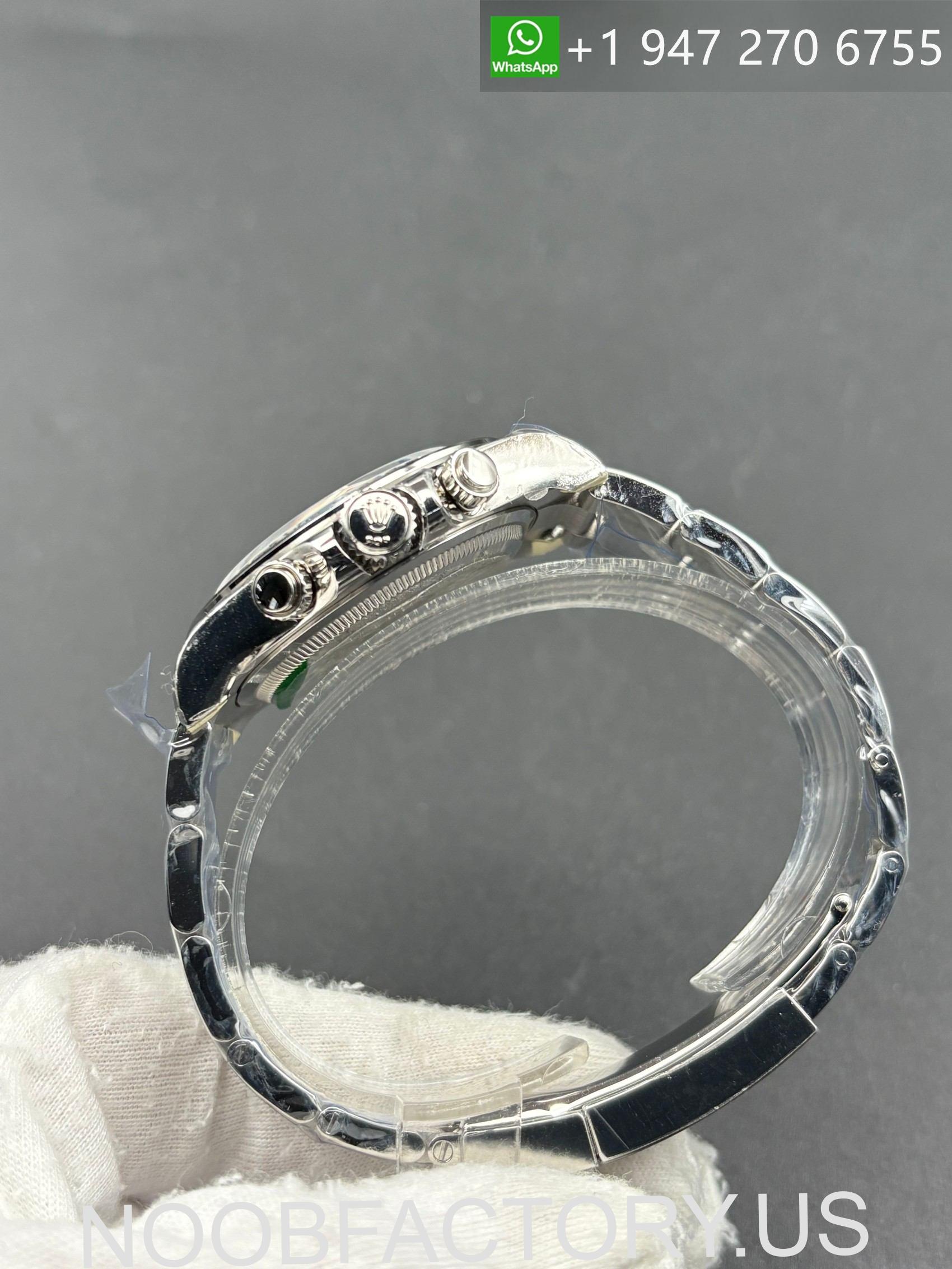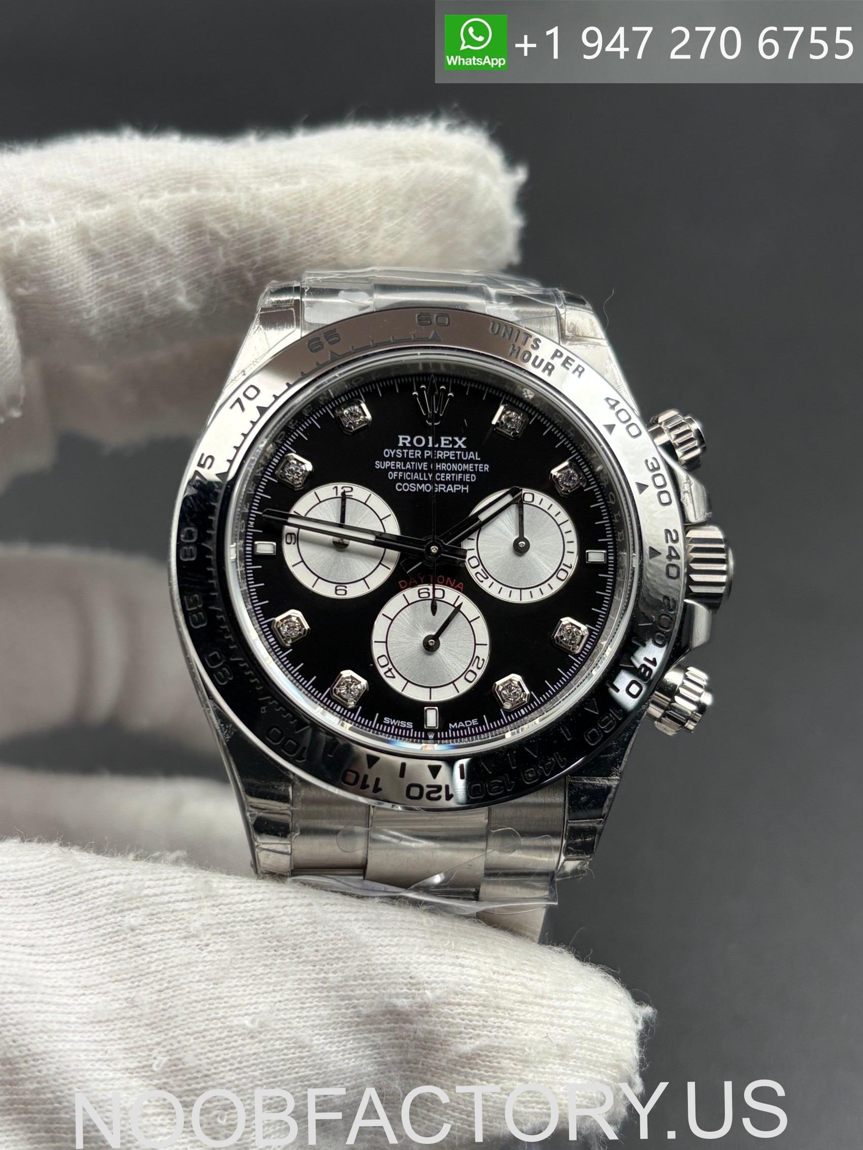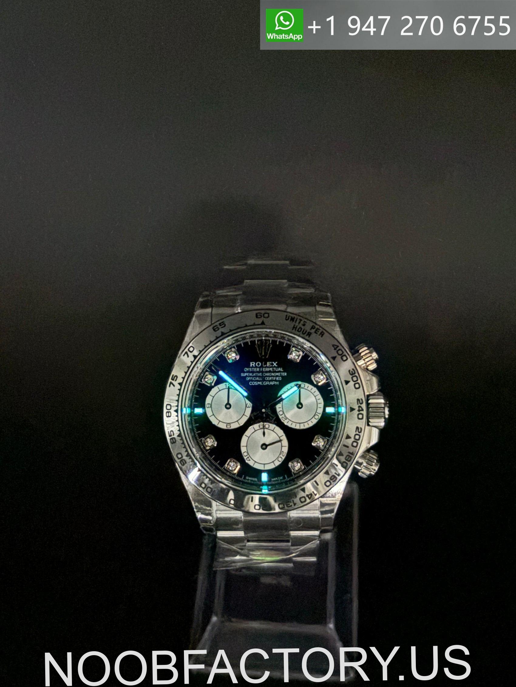 Each detail—from the diamond-set hour markers to the alignment of the engraved bezel markings—is crafted to ensure this replica stands parallel in quality and aesthetic presence to the original Rolex Daytona. The NOOB Factory’s dedication to craftsmanship is evident in every component, making this timepiece not only a luxurious statement piece but also a refined achievement in modern watchmaking.