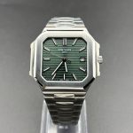 The olive green sunburst dial showcases horizontal embossed lines that pay tribute to the classic Nautilus wave pattern while offering a sharper, contemporary visual impact. Baton hands and hour markers with luminous finishing ensure both clarity and elegance. The date window at 3 o’clock maintains the design’s symmetry and practical use. -
